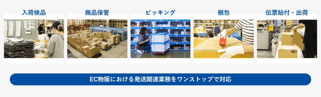 特徴としては、EC物流に必要な一連の業務があらかじめセット化されている点にあります。たとえば、以下のような標準業務がパッケージとして提供されます。
