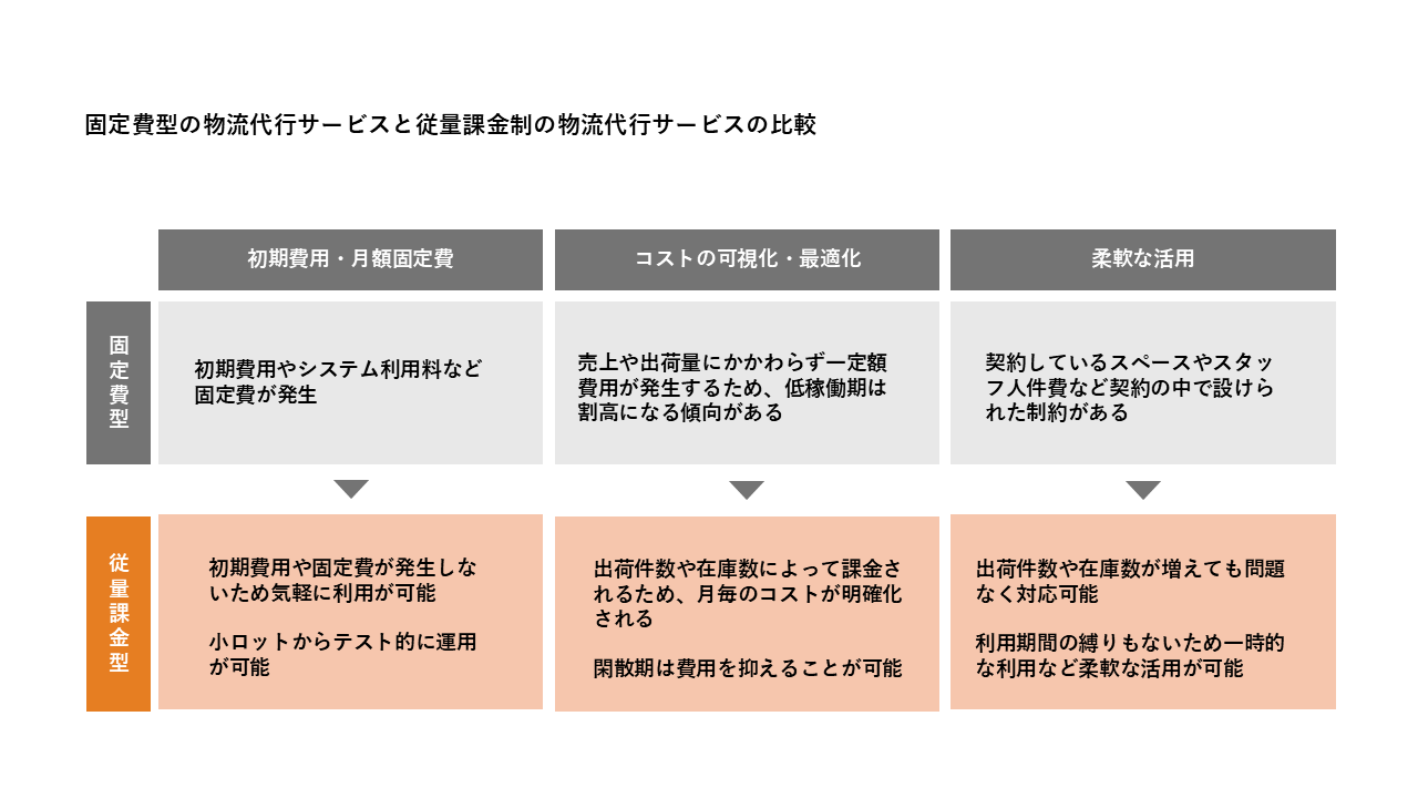 完全従量課金制の物流代行サービスは、従来の固定費型のサービスと比較して事業規模を問わず導入することのできる導入ハードルの低さや、固定費がかからないことによる短期利用など柔軟な活用方法が注目されています。