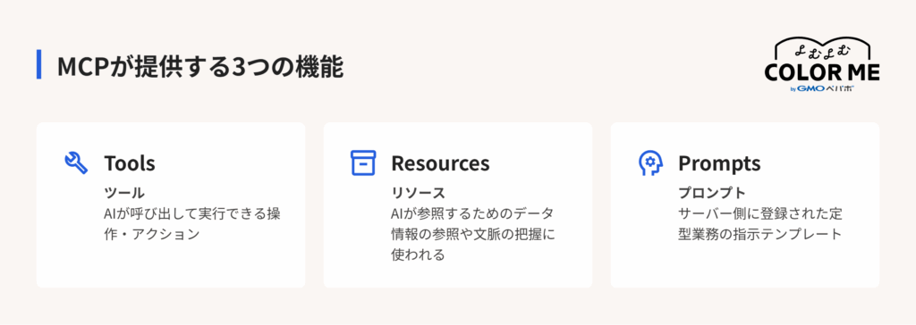 MCPサーバーがAIに提供できる主な機能は、Tools、Resources、Promptsの3つです。それぞれ役割が異なるため、違いを押さえておくと理解しやすくなります。