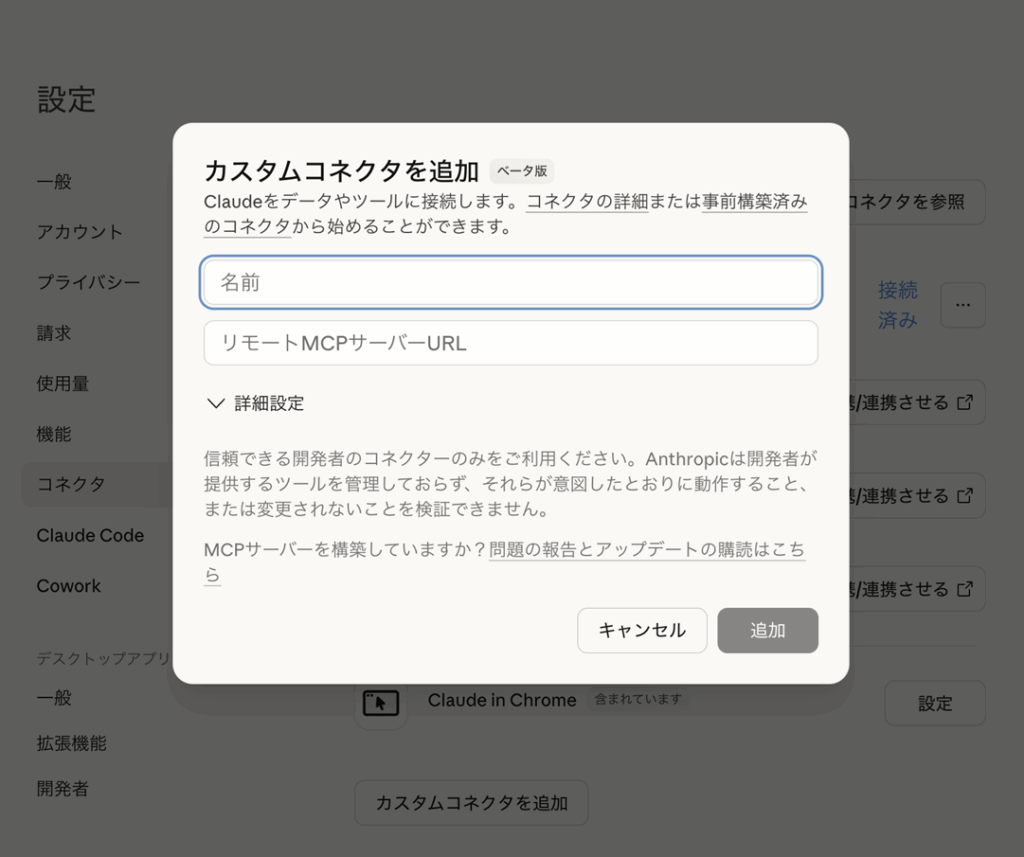 表示された入力画面に、先ほどコピーしたリモートMCPサーバーURLをペースト。