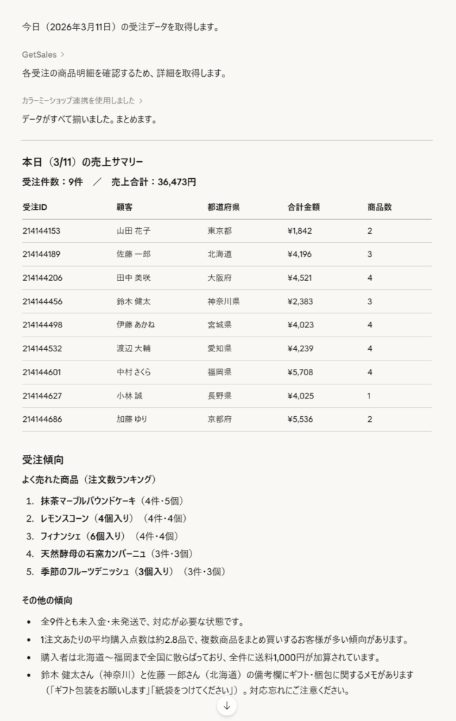 AIツールとショップを連携させて、いつものようにチャットで話しかけるだけで、受注確認や商品管理などが行えるのだそうです。