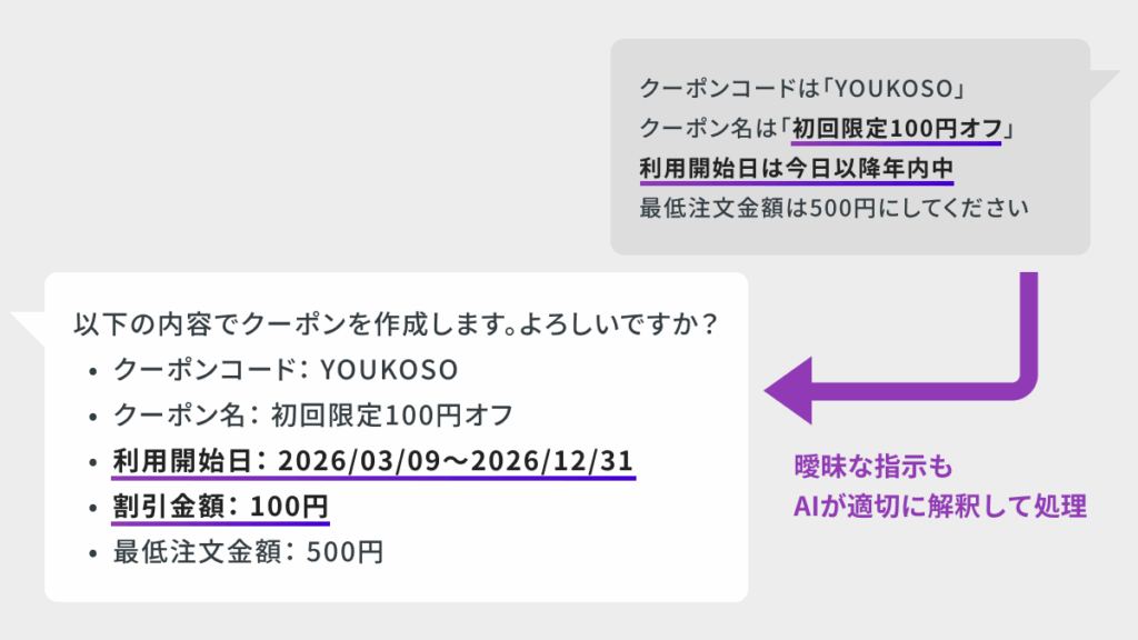 たとえばクーポンを作る際も、「利用期間は年内」などと軽く伝えるだけでも、「2026/12/31まで」と解釈してくれます。