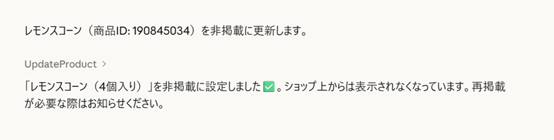 クロスセル分析の結果を眺めながら、「レモンスコーンの掲載を取り下げて」と指示したところ、該当の商品をサクッと特定して非掲載に設定してくれました。