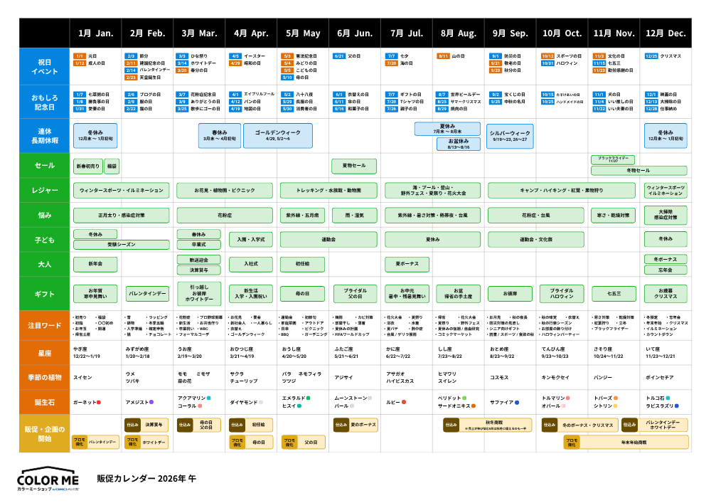 カラーミーショップの販促カレンダーには、一年間の祝日や月ごとのイベントをはじめとした、さまざまな情報が載っています。