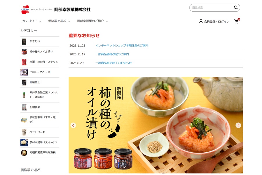 「柿の種のオイル漬け」や「かきたね」などの人気商品を販売する新潟県の米菓メーカーのECサイトです。